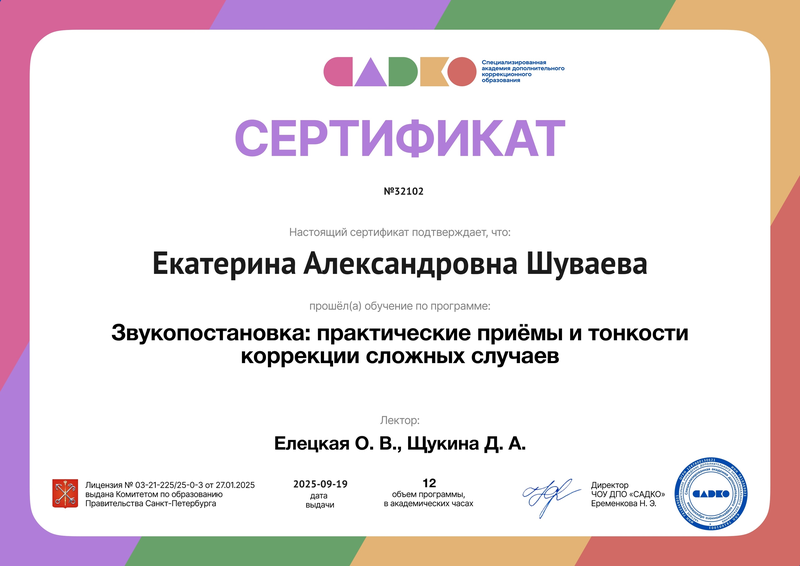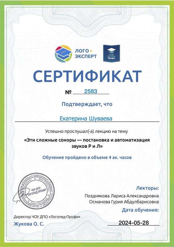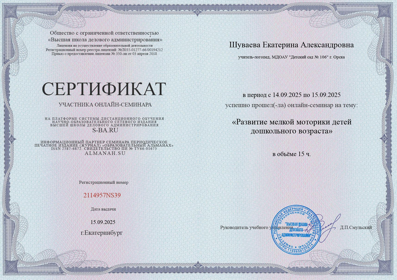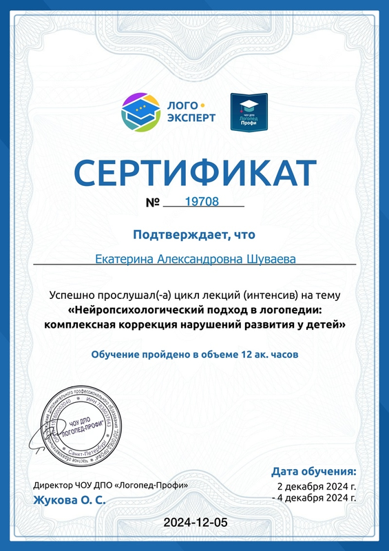 Сертификат участника интенсива «Нейропсихологический подход в логопедии: комплексная коррекция нарушений развития у детей» - от 05.12.2024 г., № 19708