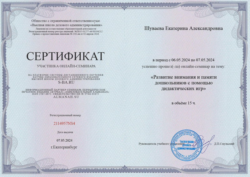 Сертификат участника онлайн-семинара на тему «Развитие внимания и памяти дошкольников с помощью дидактических игр» в объеме 15 часов. - № 2114957NS4 от 07.05.2024 г.
