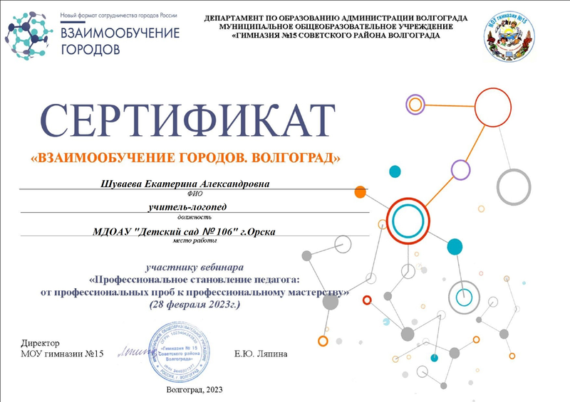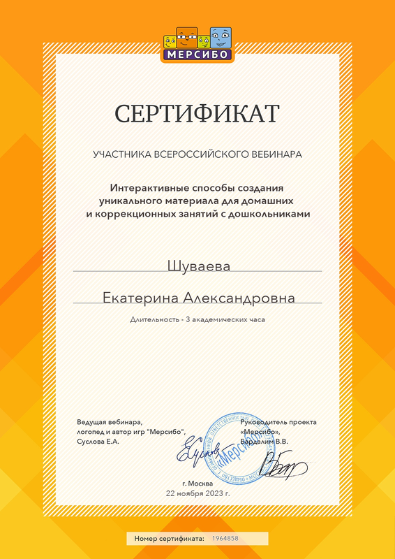Сертификат участника Всероссийского вебинара «Интерактивные способы создания уникального материала для домашних и коррекционных занятий с дошкольниками". № 1964858 от 22.10.2023 г.