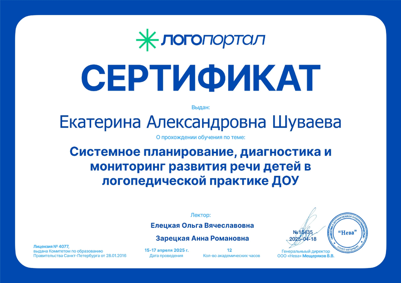 Сертифика о прохождении обучения «Системное планирование, диагностика и мониторинг развития речи детей в логопедической практике ДОУ» (12 часов) - № 15435 от 15-17 апреля 2025 г.