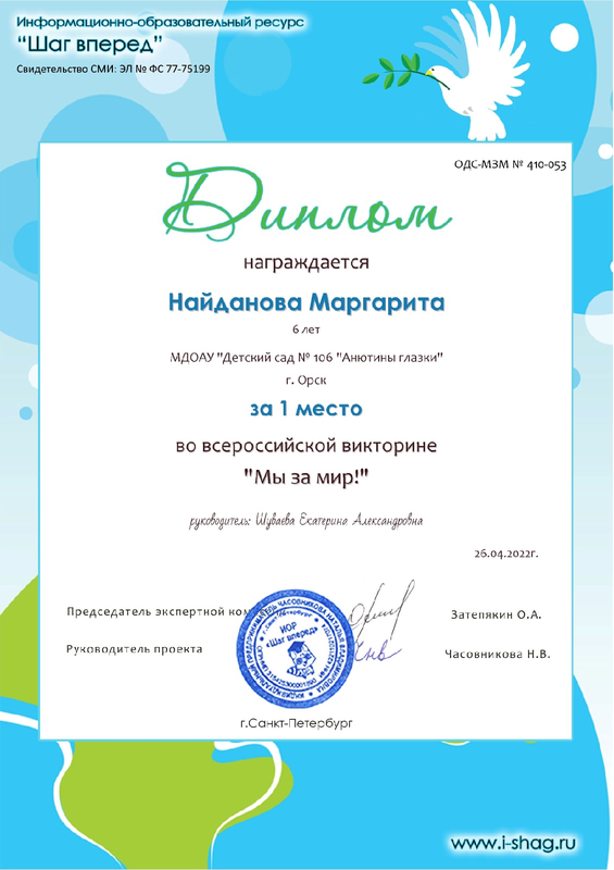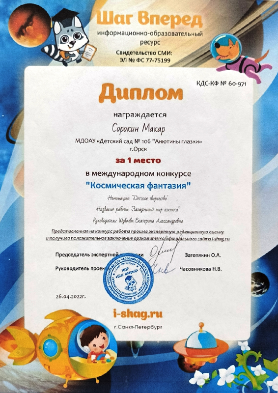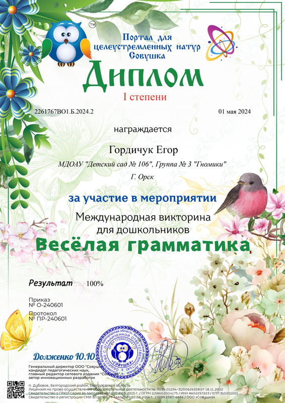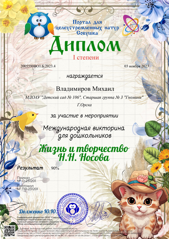 Владимиров Михаил – Диплом I степени за участие в Международной викторине для дошкольников «Жизнь и творчество Н.Н. Носова», от 03.11.2023 г.