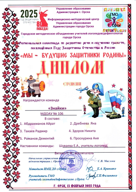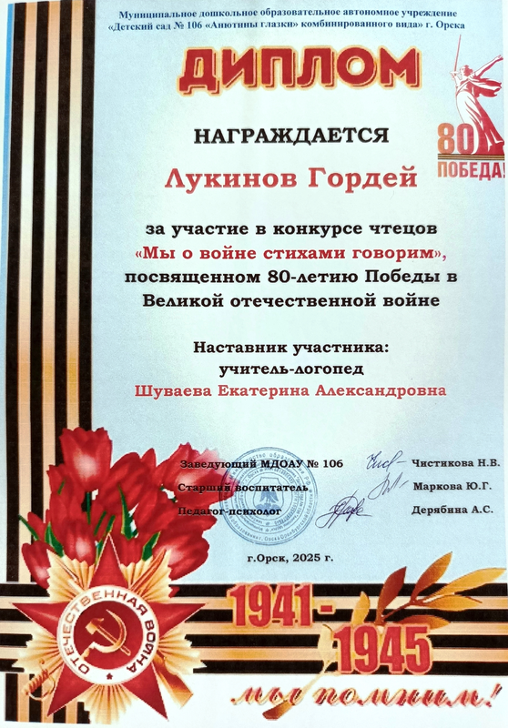Лукинов Гордей – диплом за участие в конкурсе-чтецов «Мы о войне стихами говорим», посвященном 80-летию Победы в Великой отечественной войне», май, 2025 г.