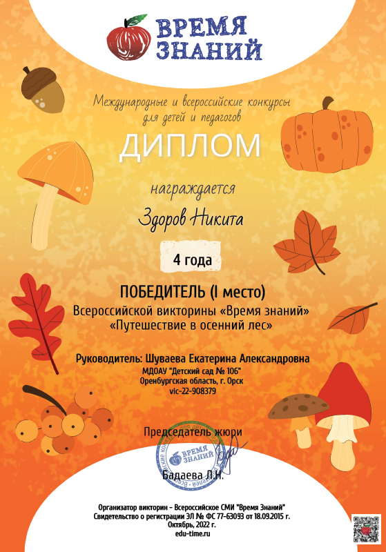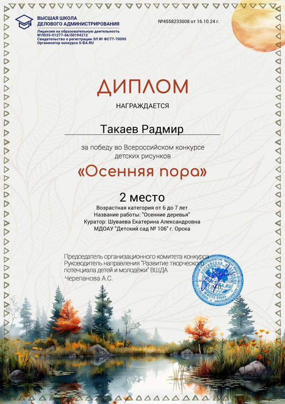 Такаев Радмир - диплом победителя (2 место) за победу во Всероссийском конкурсе детских рисунков «Осенняя пора» Название работы: «Осенние деревья», 16.10.2024 г.