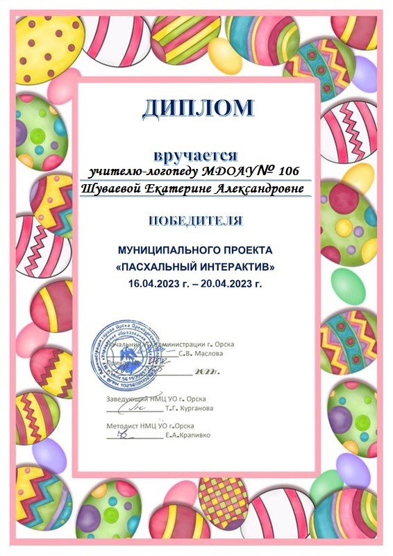 Диплом победителя муниципального проекта «Пасхальный интерактив» 16.04.23г.-20.04.23г.