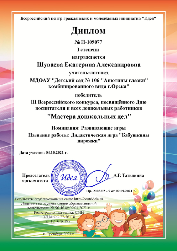 Диплом победителя (I степени) III Всероссийского конкурса, посвященного Дню воспитателя и всех дошкольных работников "Мастера дошкольных дел"