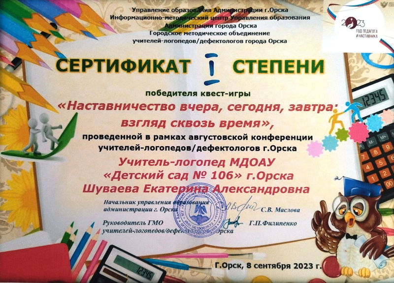 Сертификат победителя квест – игры «Наставничество вчера, сегодня, завтра: взгляд сквозь время», проведенной в рамках августовской конференции учителей – логопедов/дефектологов г. Орска., от 8 сентября 2023 г.