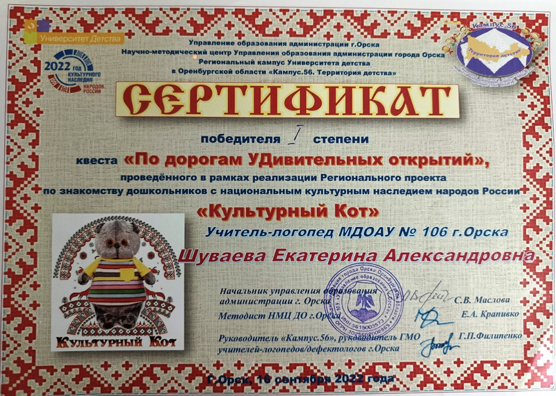 Сертификат победителя I степени квеста "По дорогам УДивительных открытий", в рамках реализации Регионального проекта по знакомству дошкольников с национальным культурным наследием народов России "Культурный кот", 16 сентября 2022 г.