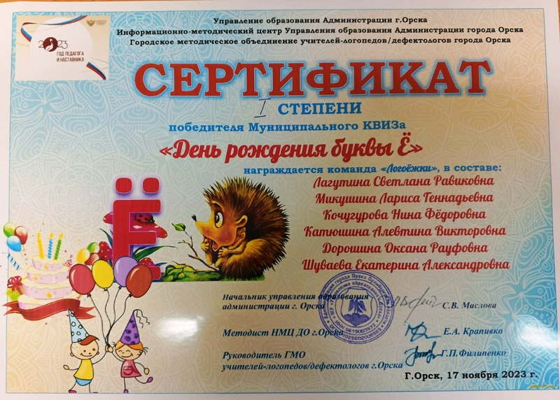 Сертификат I степени победителя Муниципального КВИЗА «День рождения буквы Ё» от 17 ноября 2023 г.
