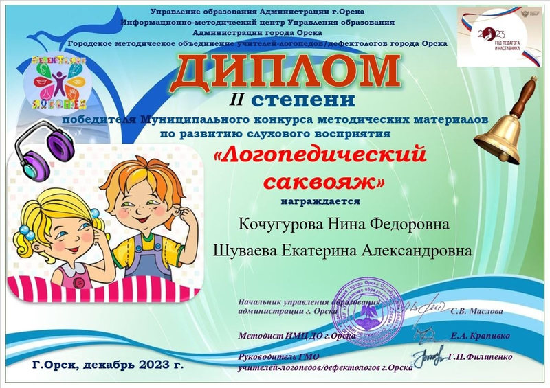 Диплом победителя II степени победителя Муниципального конкурса методических материалов по развитию слухового восприятия "Логопедический саквояж", декабрь 2023 г.