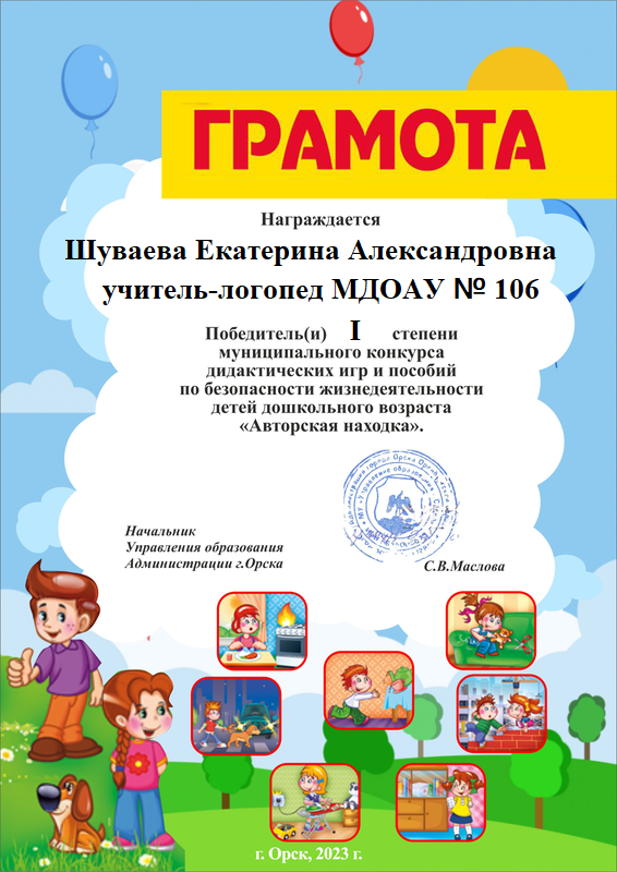 Грамота победителя I степени муниципального конкурса дидактических игр и пособий по безопасности