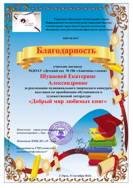 Благодарность за реализацию муниципального творческого конкурса - выставки по приобщению обучающихся к художественной литературе "Добрый мир любимых книг" от 31.10.2023 г.