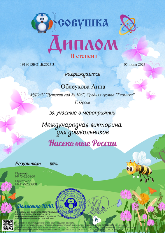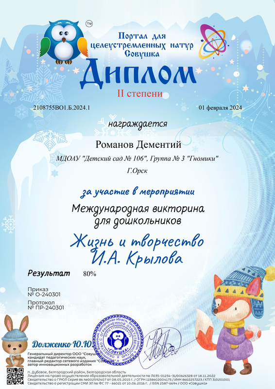 Романов Дементий – Диплом II степени в международной викторине для дошкольников Жизнь и творчество И.А. Крылова – 01.02.2024 г.