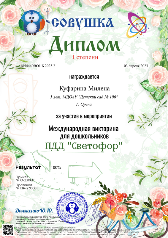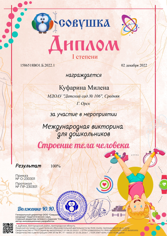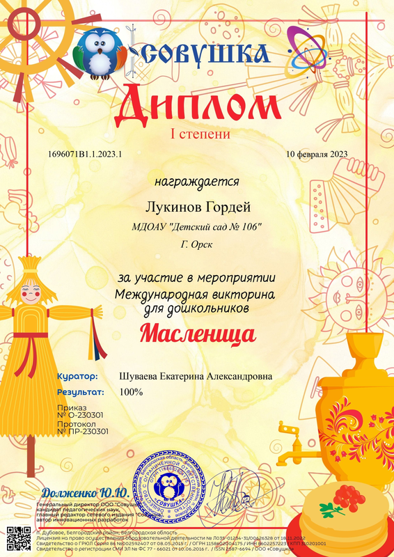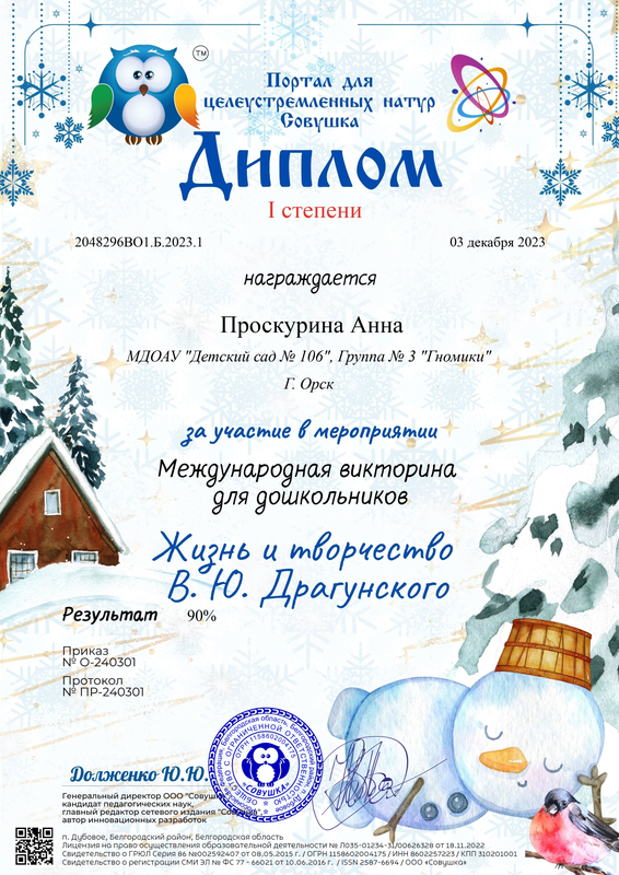 Проскурина Анна – Диплом I степени за участие в Международной викторине для дошкольников «Жизнь и творчество В.Ю. Драгунского» от 03.12.23 г.