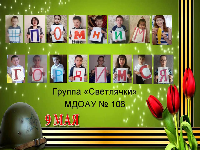 В этом году мы отмечаем 80-летие со дня Великой Победы – дня, который вписан в историю подвигом наших дедов и прадедов. Воспитанники старшей группы № 4 группа № 9 "Семицветик" , "Мультяшки", подготовительные группы № 1 "Барбарики ", № 2 "Смешарики", № 7 "Говорящие попугайчики" присоединились к Всероссийской акции "Бессмертный полк".