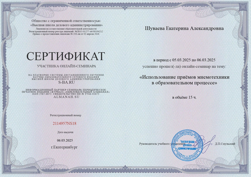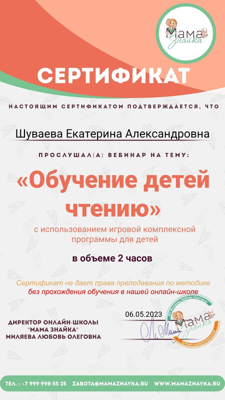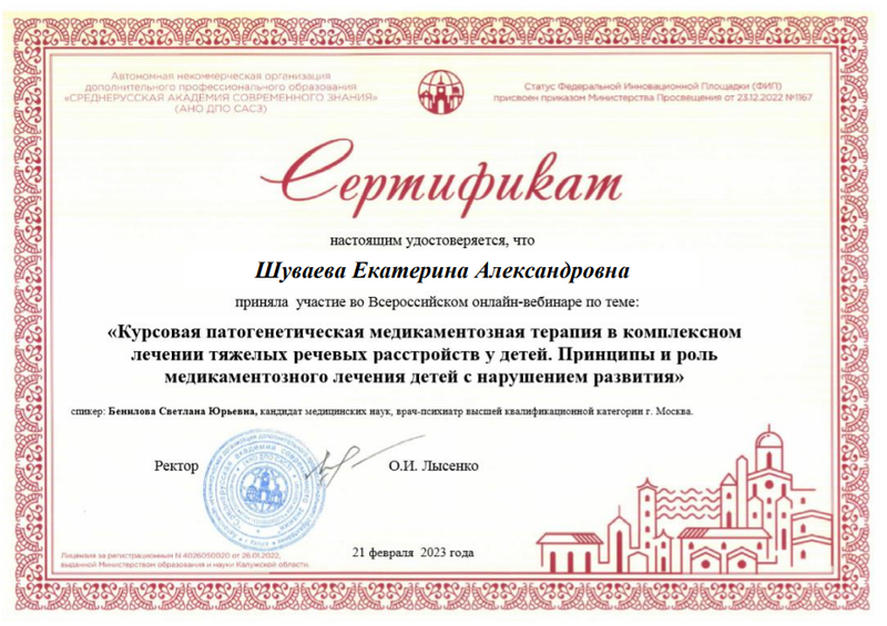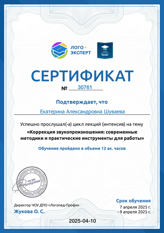 Сертификат участника интенсива «Коррекция звукопроизношения: современные методики и практические инструменты для работы» (12 часов) – № 30761 от 7-9 апреля 2025 г.