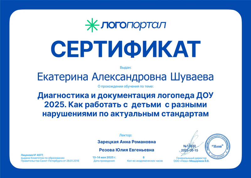 Сертификат о прохождении обучения «Диагностика и документация логопеда ДОУ 2025. Как работать с детьми с разными нарушениями по актуальным стандартам» (8 часов) - от 13-14 мая 2025 г. № 17630